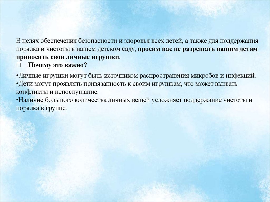 В целях обеспечения безопасности и здоровья всех детей, а также для поддержанияпорядка и чистоты в нашем детском саду, просим вас не разрешать вашим детям