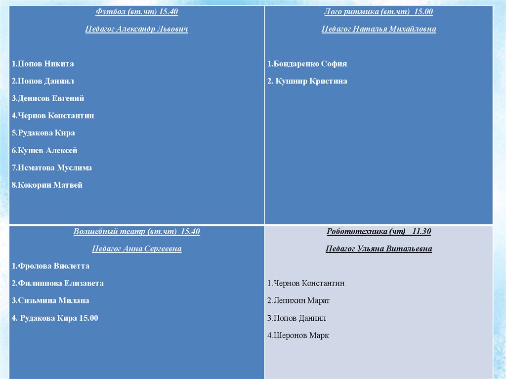 Футбол (вт.чт) 15.40Лого ритмика (вт.чт) 15.00