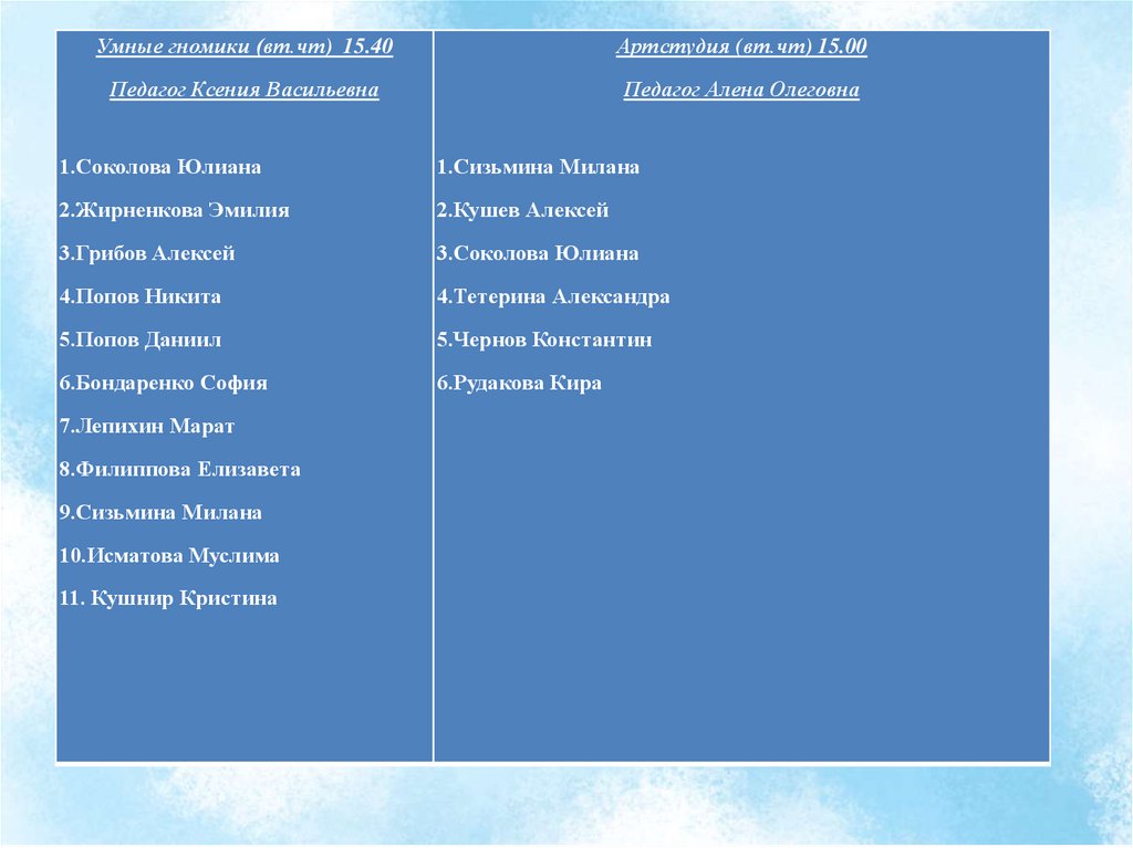 Умные гномики (вт.чт) 15.40Артстудия (вт.чт) 15.00