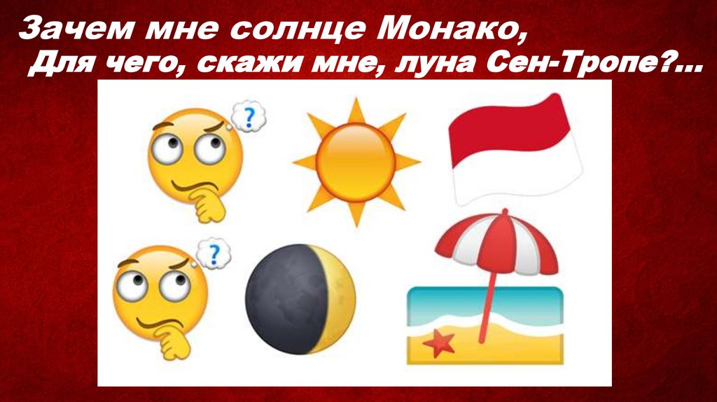 Зачем мне солнце Монако,Для чего, скажи мне, луна Сен-Тропе?…