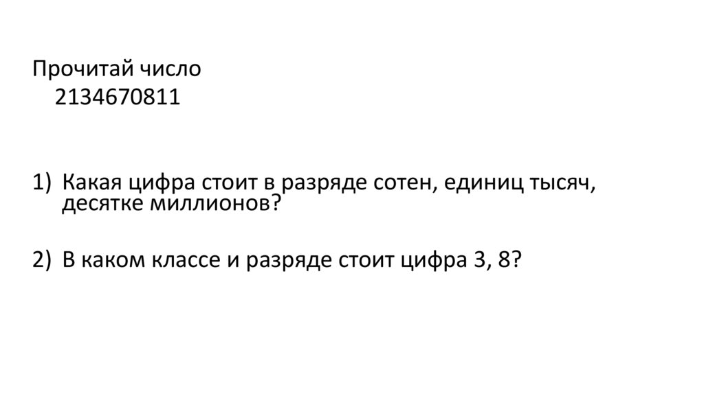 1) Какая цифра стоит в разряде сотен, единиц тысяч,