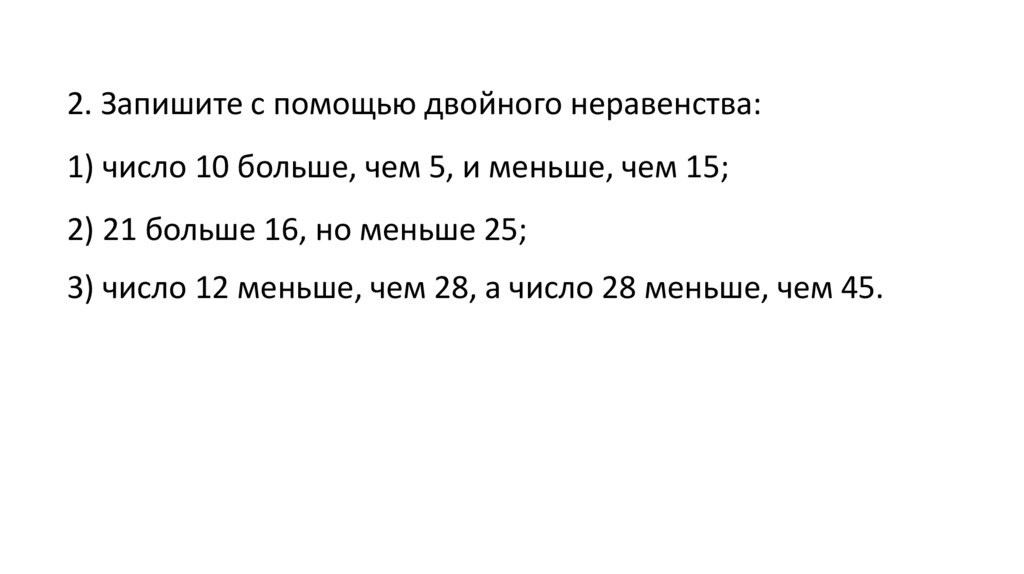 2. Запишите с помощью двойного неравенства:1) число 10 больше, чем 5, и меньше, чем 15;