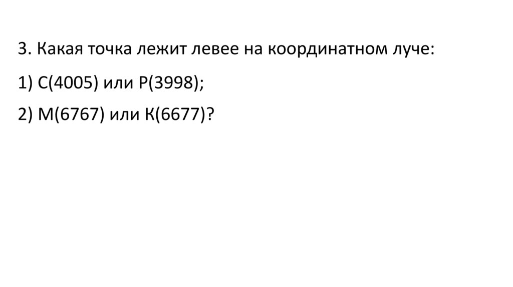 3. Какая точка лежит левее на координатном луче:1) С(4005) или Р(3998);