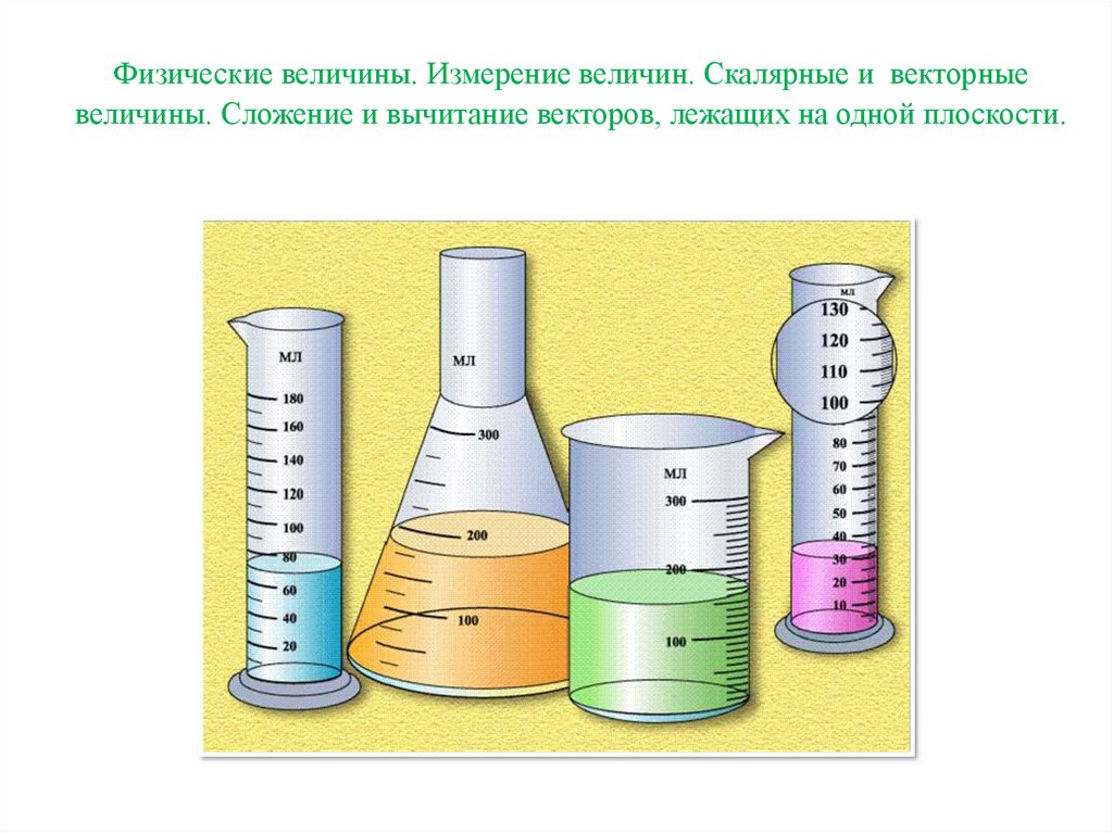 Физические величины. Измерение величин. Скалярные и векторныевеличины. Сложение и вычитание векторов, лежащих на одной плоскости.