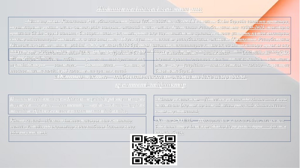 Жобаның негіздемесі мен мазмұны:«Білім туралы» Қазақстан Республикасының Заңы (27.07.2007 ж., №319-III): жалпы білім берудің сапасын арттыру,