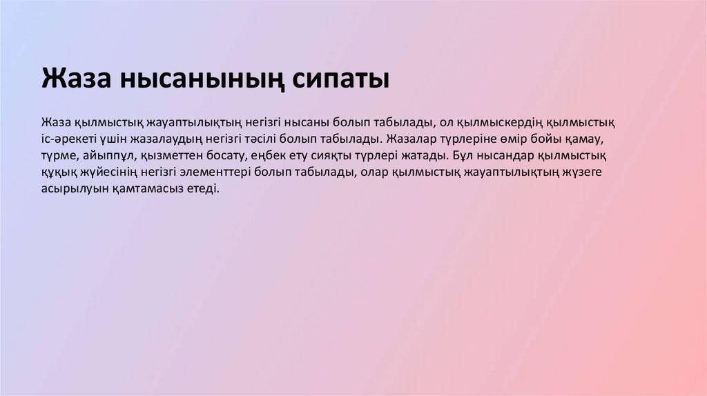 Жаза нысанының сипатыЖаза қылмыстық жауаптылықтың негізгі нысаны болып табылады, ол қылмыскердің қылмыстық