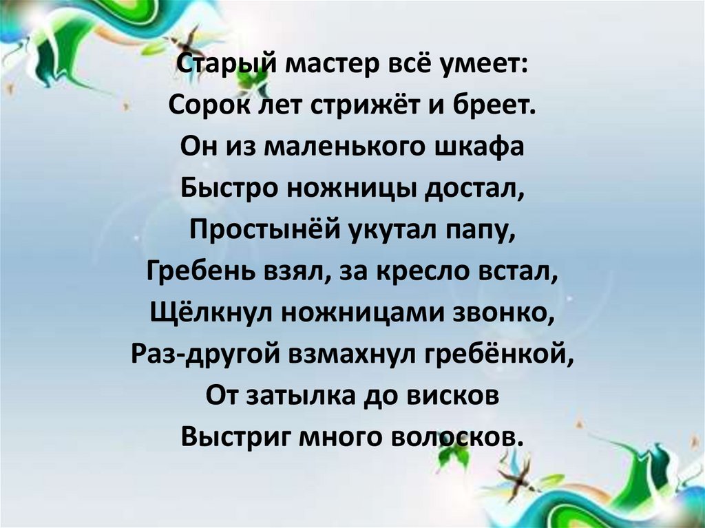 Старый мастер всё умеет:Сорок лет стрижёт и бреет.