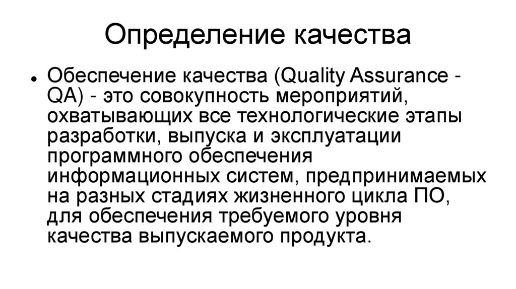Определение качестваОбеспечение качества (Quality Assurance QA) - это совокупность мероприятий,