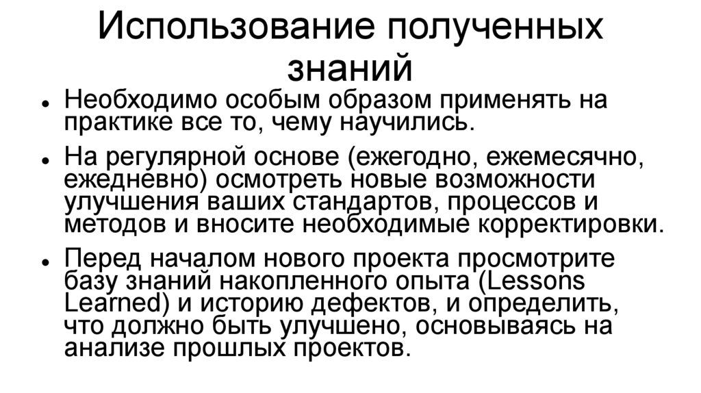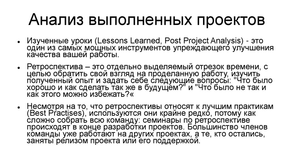 Анализ выполненных проектовИзученные уроки (Lessons Learned, Post Project Analysis) - это
