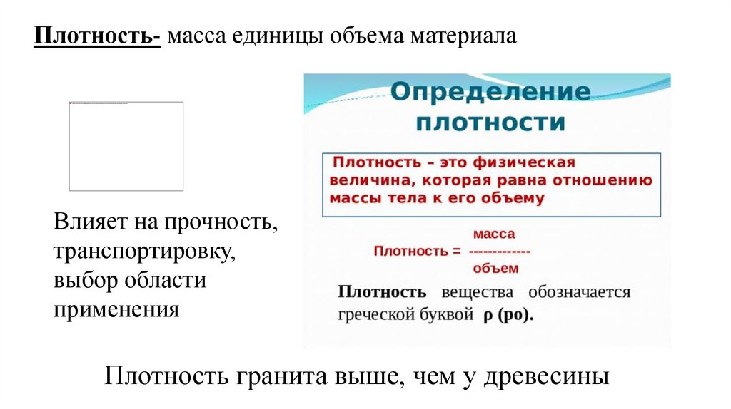 Плотность- масса единицы объема материалаВлияет на прочность,