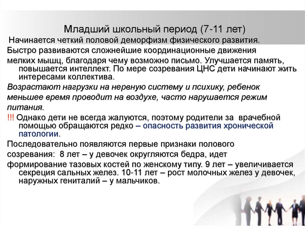 Младший школьный период (7-11 лет)Начинается четкий половой деморфизм физического развития.
