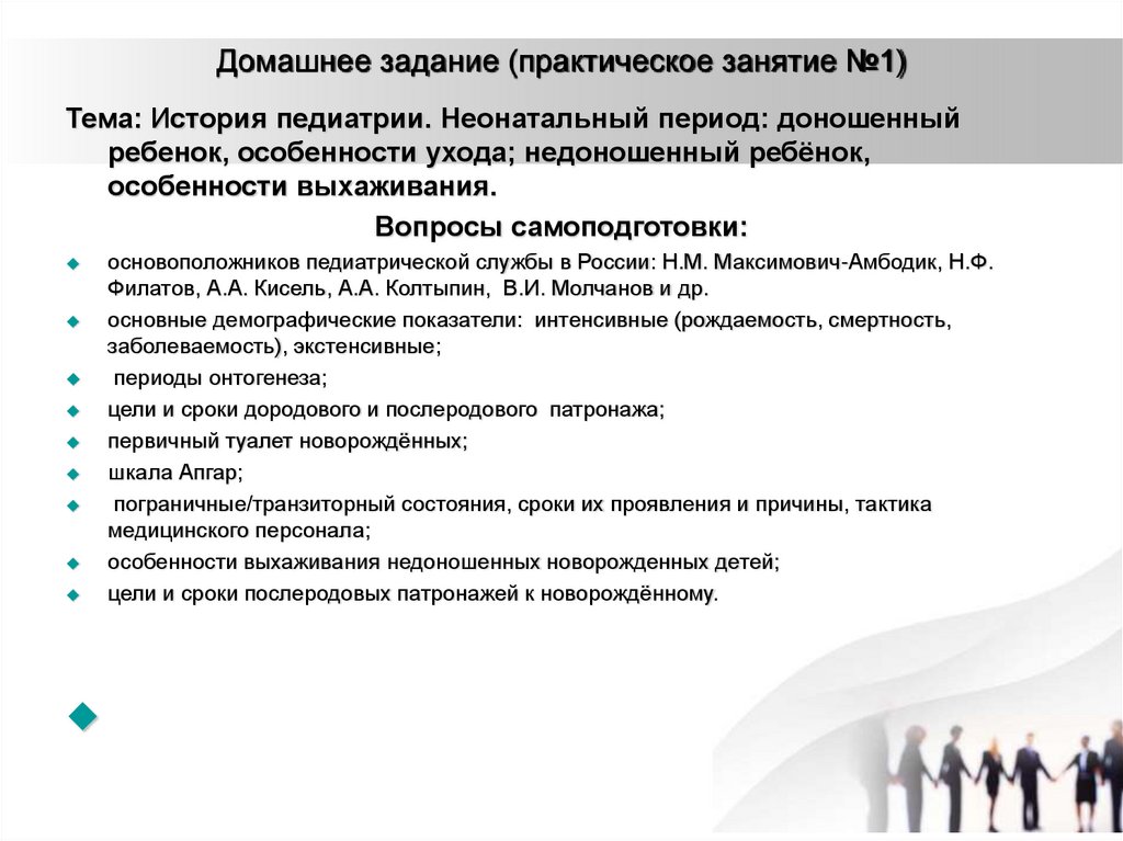 Домашнее задание (практическое занятие №1)Тема: История педиатрии. Неонатальный период: доношенный