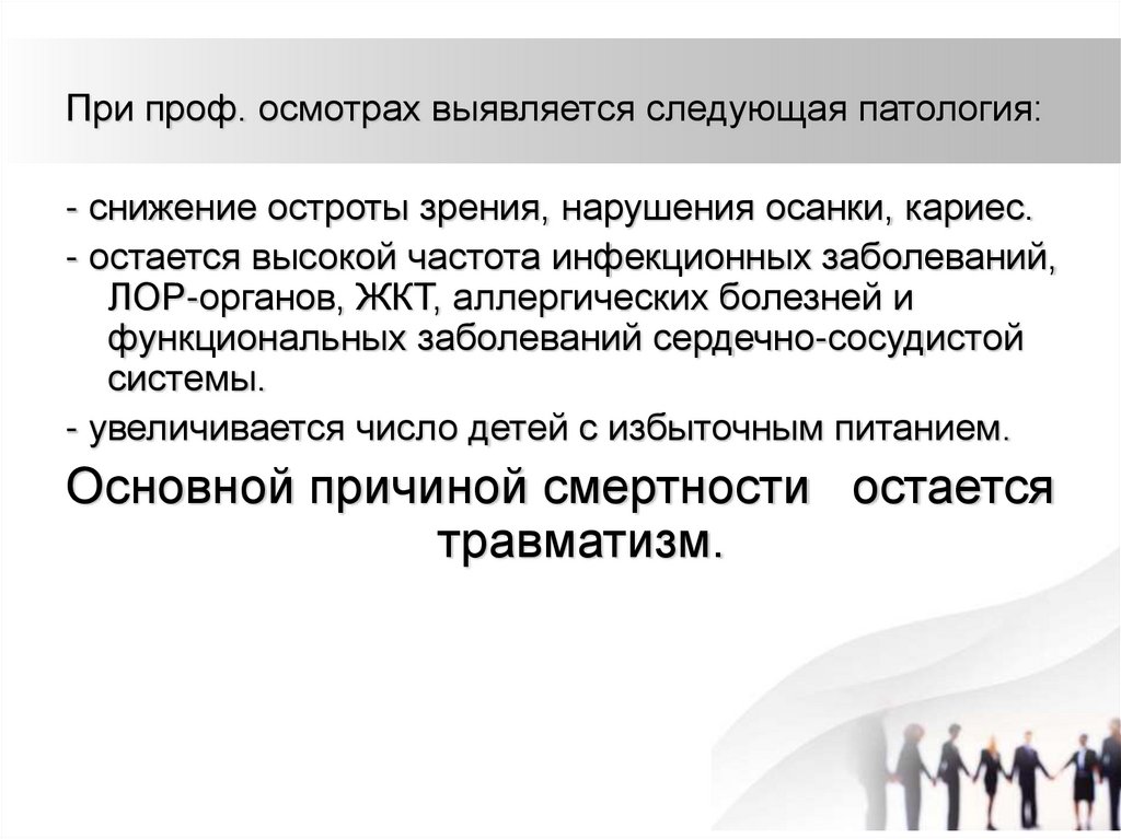 При проф. осмотрах выявляется следующая патология:- снижение остроты зрения, нарушения осанки, кариес.