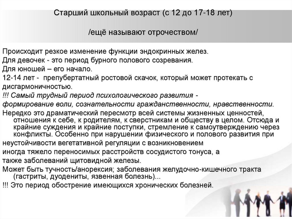 Старший школьный возраст (с 12 до 17-18 лет)/ещё называют отрочеством/