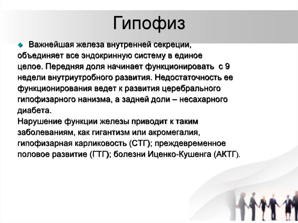 половое развитие (ГТГ); болезни Иценко-Кушенга (АКТГ).