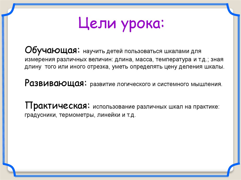 Цели урока:Обучающая: научить детей пользоваться шкалами для
