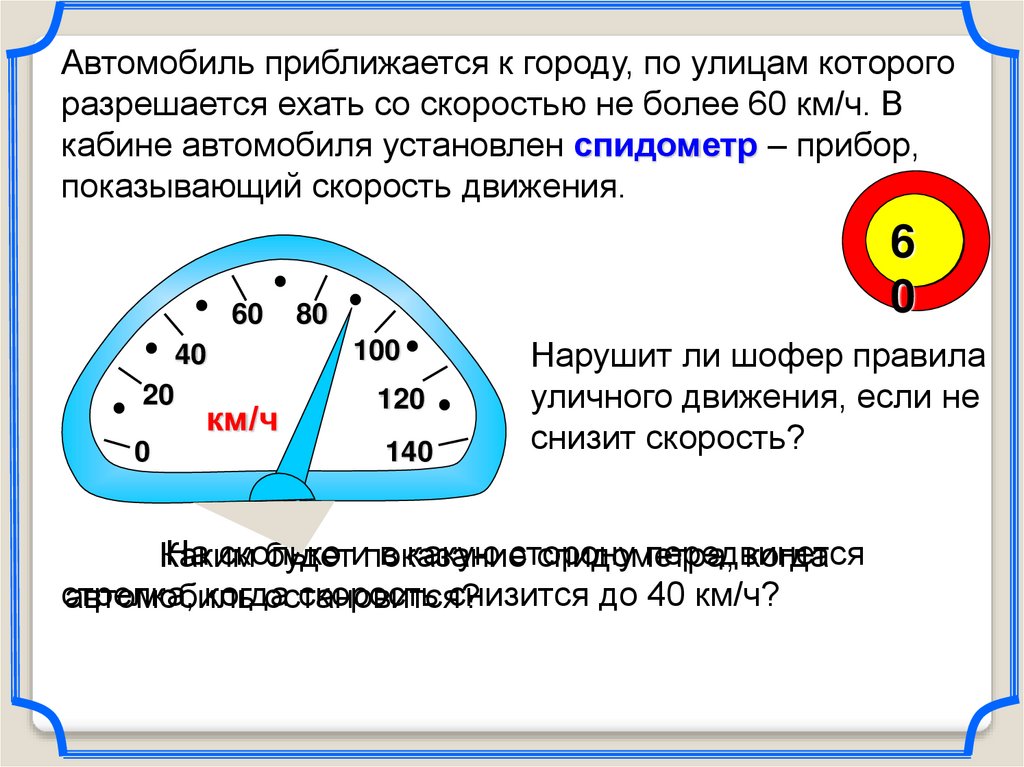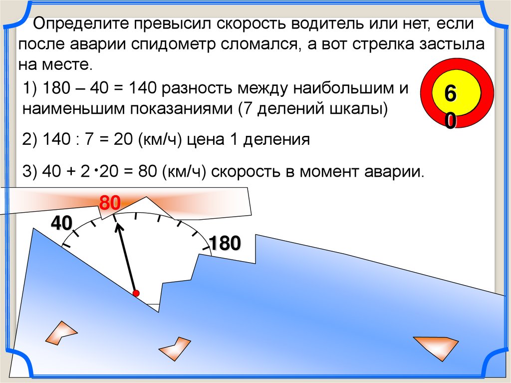 Определите превысил скорость водитель или нет, еслипосле аварии спидометр сломался, а вот стрелка застыла