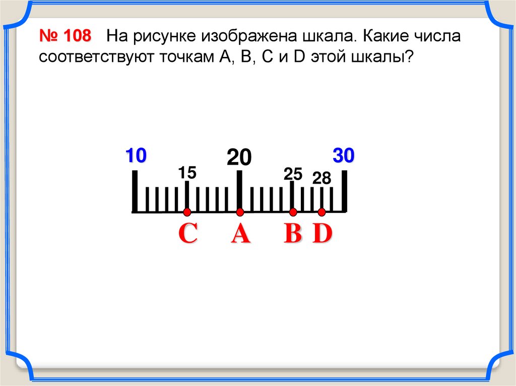 № 108 На рисунке изображена шкала. Какие числасоответствуют точкам А, В, С и D этой шкалы?