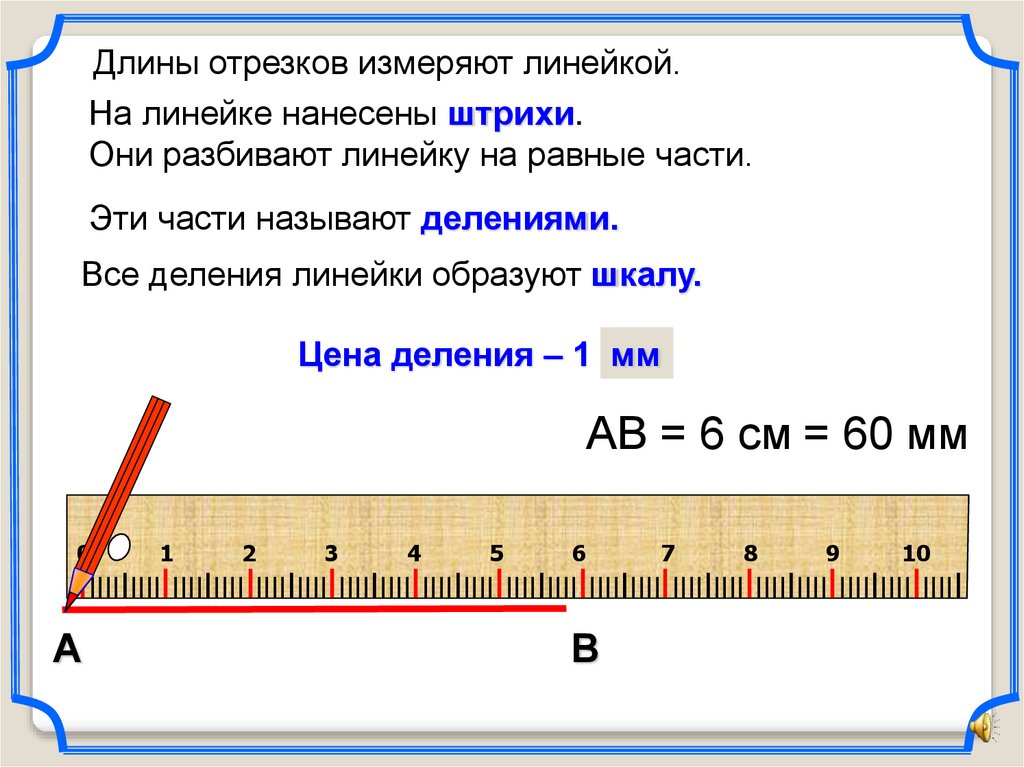 Длины отрезков измеряют линейкой.На линейке нанесены штрихи.