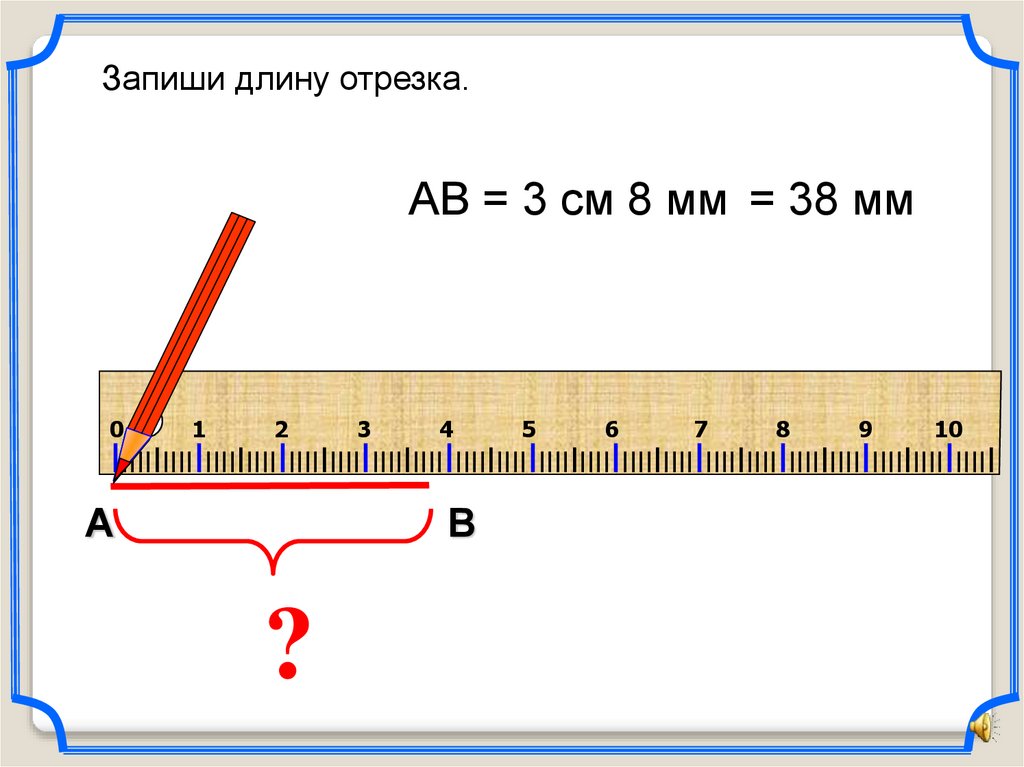 Запиши длину отрезка.АВ = 3 см 8 мм = 38 мм