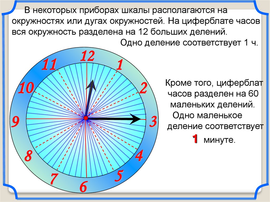 В некоторых приборах шкалы располагаются наокружностях или дугах окружностей. На циферблате часов