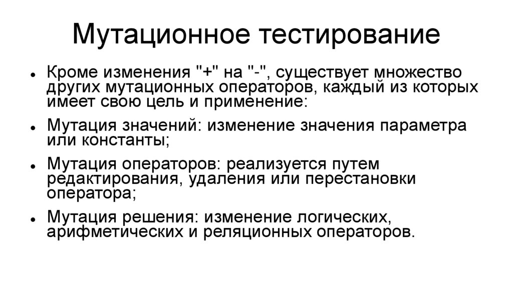 Мутационное тестированиеКроме изменения "+" на "-", существует множество
