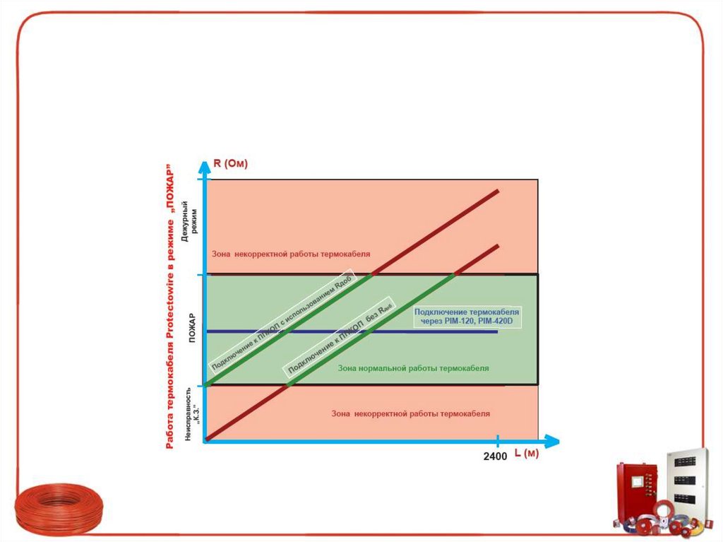 При пожаре в зоне термокабеля измеритель расстояния передает сигнал «пожар»