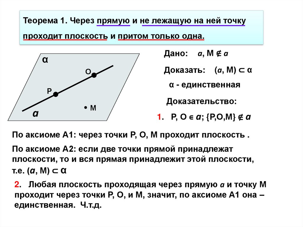 Теорема 1. Через прямую и не лежащую на ней точкупроходит плоскость и притом только одна.