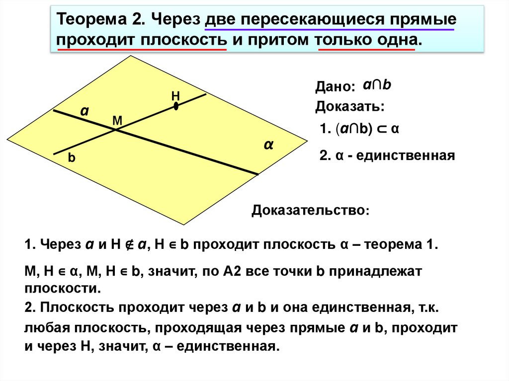 Теорема 2. Через две пересекающиеся прямыепроходит плоскость и притом только одна.