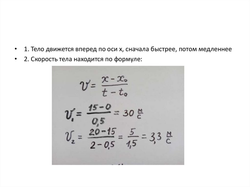 • 1. Тело движется вперед по оси х, сначала быстрее, потом медленнее• 2. Скорость тела находится по формуле: