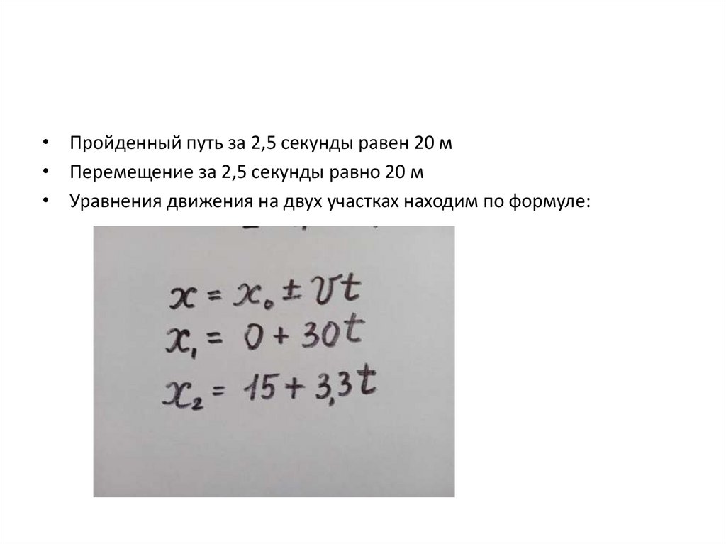 • Пройденный путь за 2,5 секунды равен 20 м• Перемещение за 2,5 секунды равно 20 м