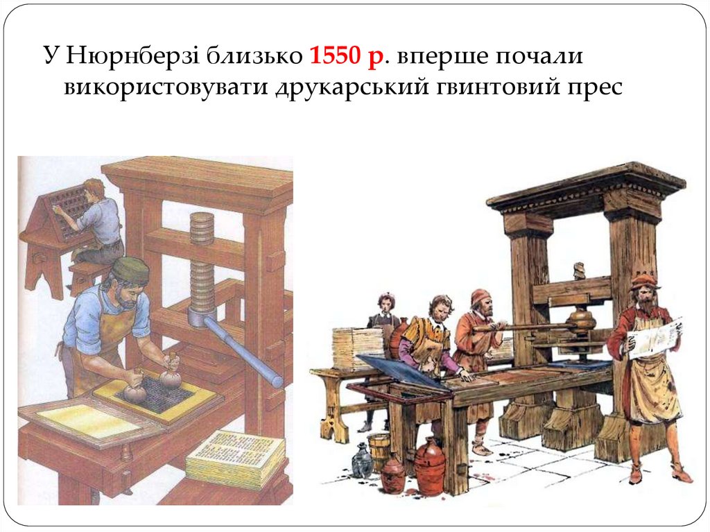 У Нюрнберзі близько 1550 р. вперше почаливикористовувати друкарський гвинтовий прес