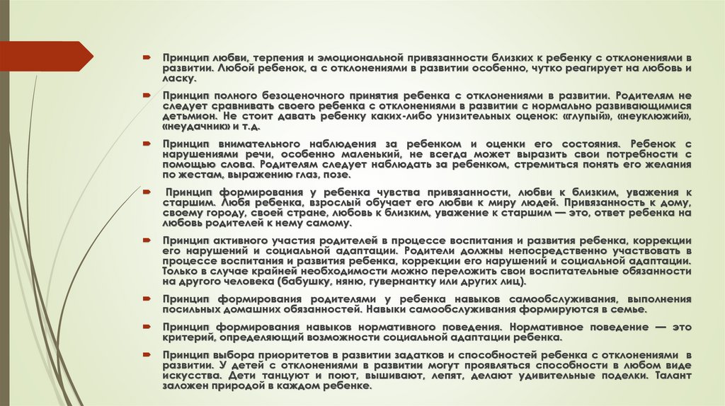 Принцип любви, терпения и эмоциональной привязанности близких к ребенку с отклонениями вразвитии. Любой ребенок, а с отклонениями в развитии особенно, чутко реагирует на любовь и