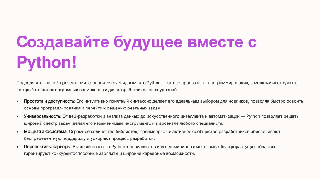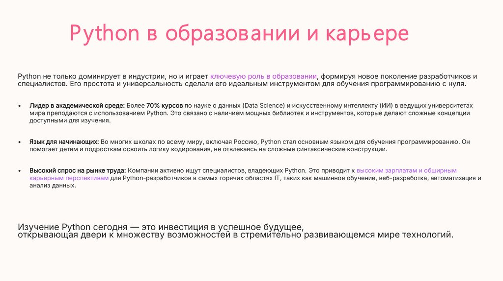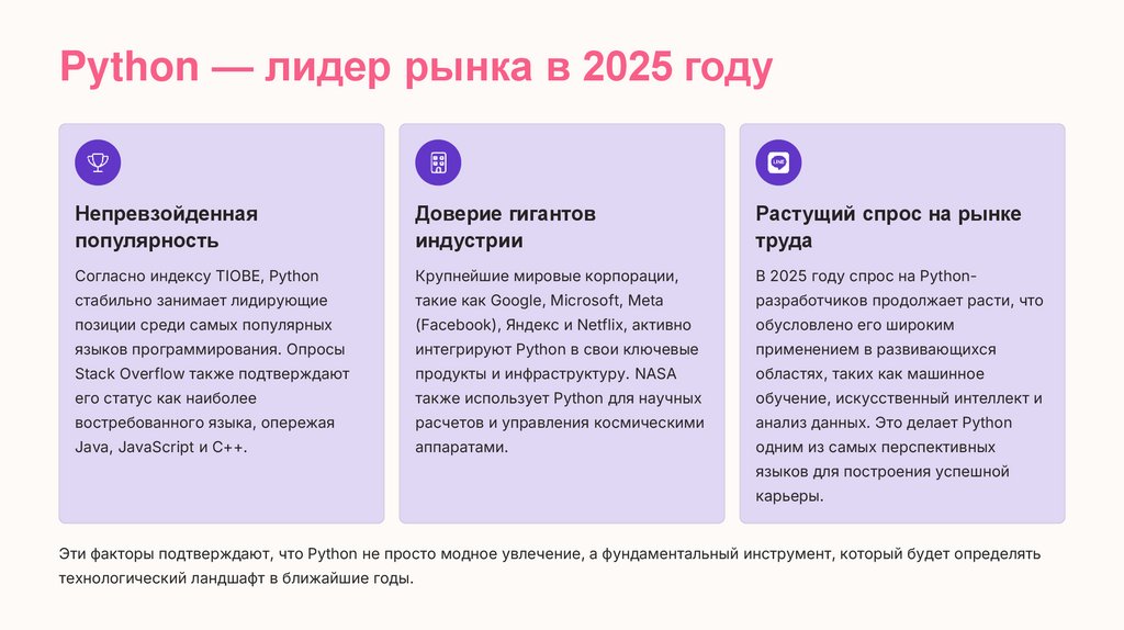 Эти факторы подтверждают, что Python не просто модное увлечение, а фундаментальный инструмент, который будет определять