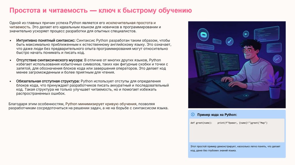 Простота и читаемость — ключ к быстрому обучениюОдной из главных причин успеха Python является его исключительная простота и