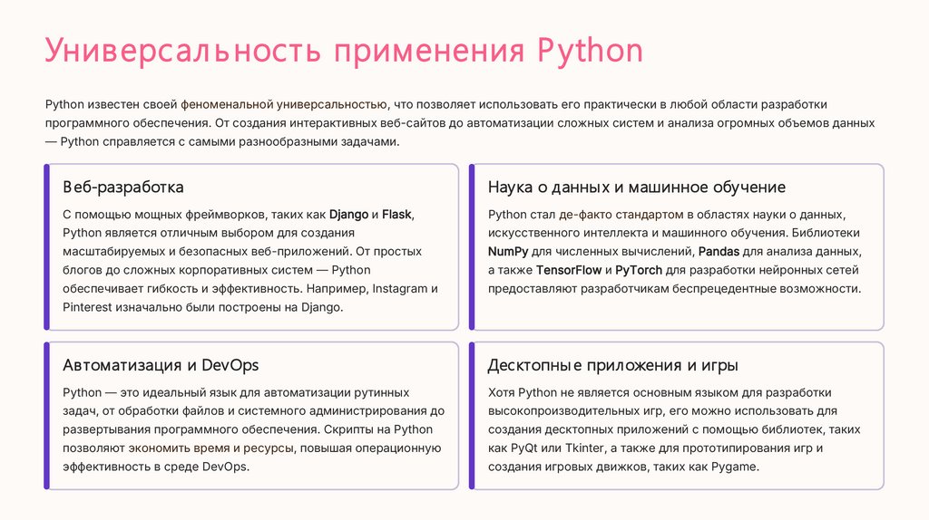 Универсальность: От веб-разработки и анализа данных до искусственного интеллекта и автоматизации — Python позволяет решать