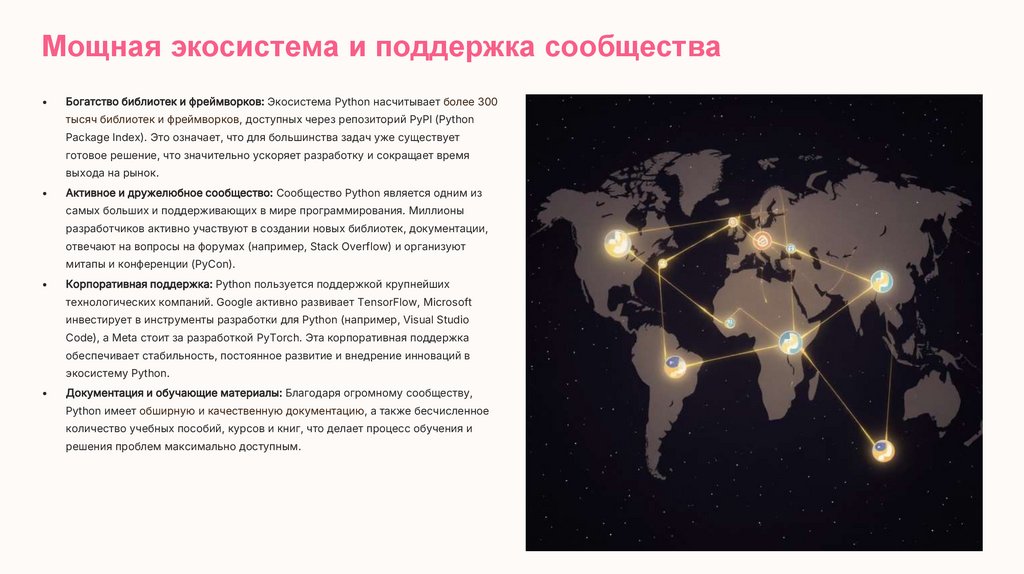 Мощная экосистема и поддержка сообществаБогатство библиотек и фреймворков: Экосистема Python насчитывает более 300