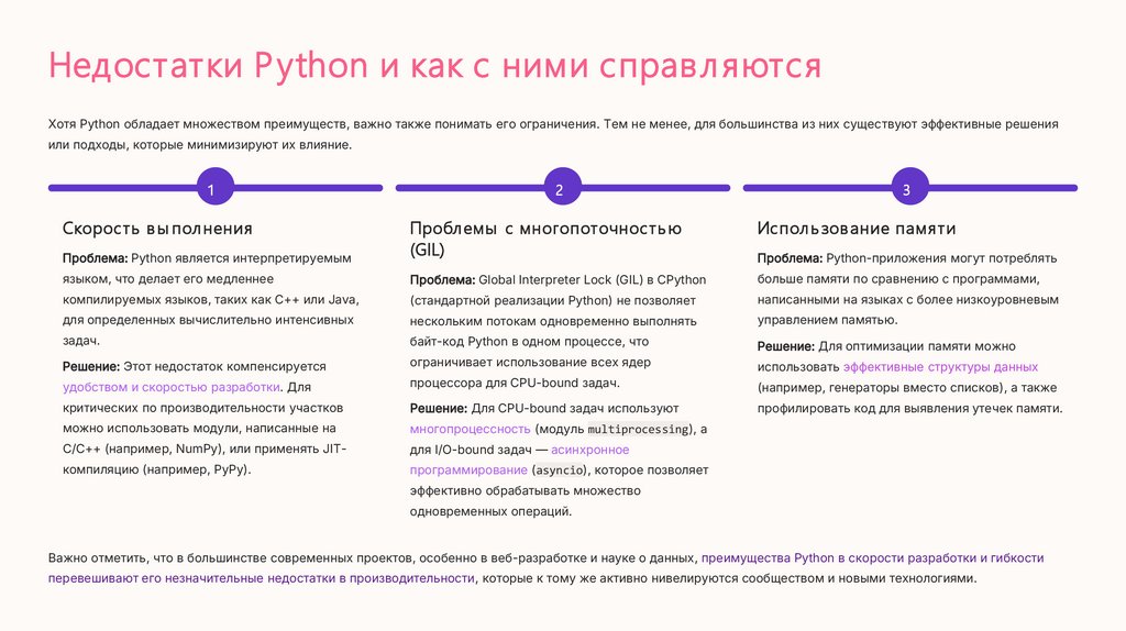 Недостатки P ython и как с ними справл яютсяХотя Python обладает множеством преимуществ, важно также понимать его ограничения. Тем не менее, для большинства из них существуют эффективные решения