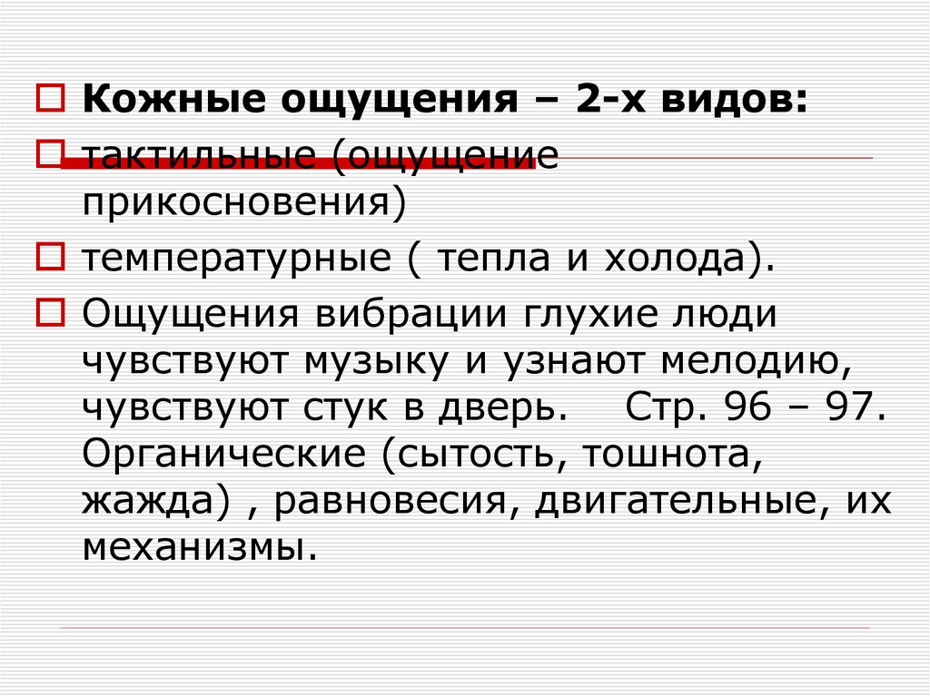 Кожные ощущения – 2-х видов:тактильные (ощущение