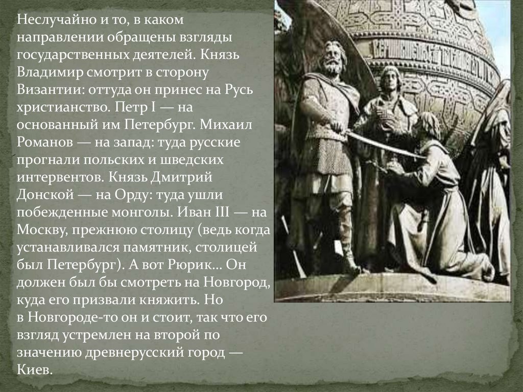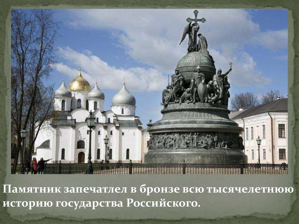 Памятник запечатлел в бронзе всю тысячелетнююисторию государства Российского.