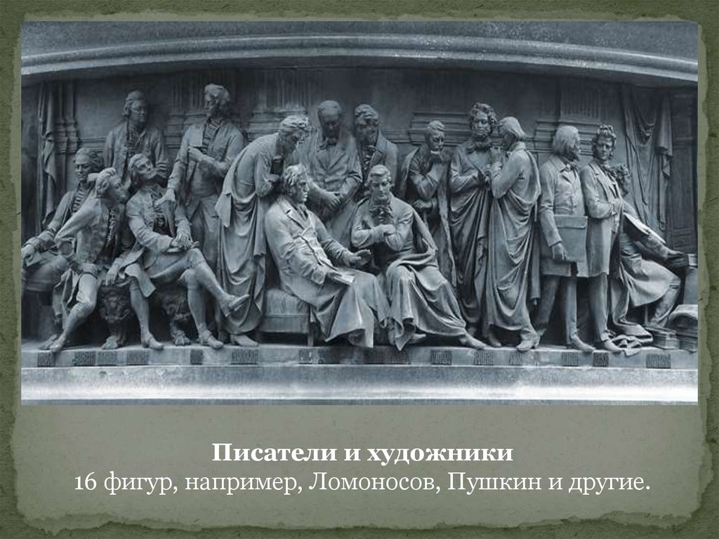 Писатели и художники16 фигур, например, Ломоносов, Пушкин и другие.