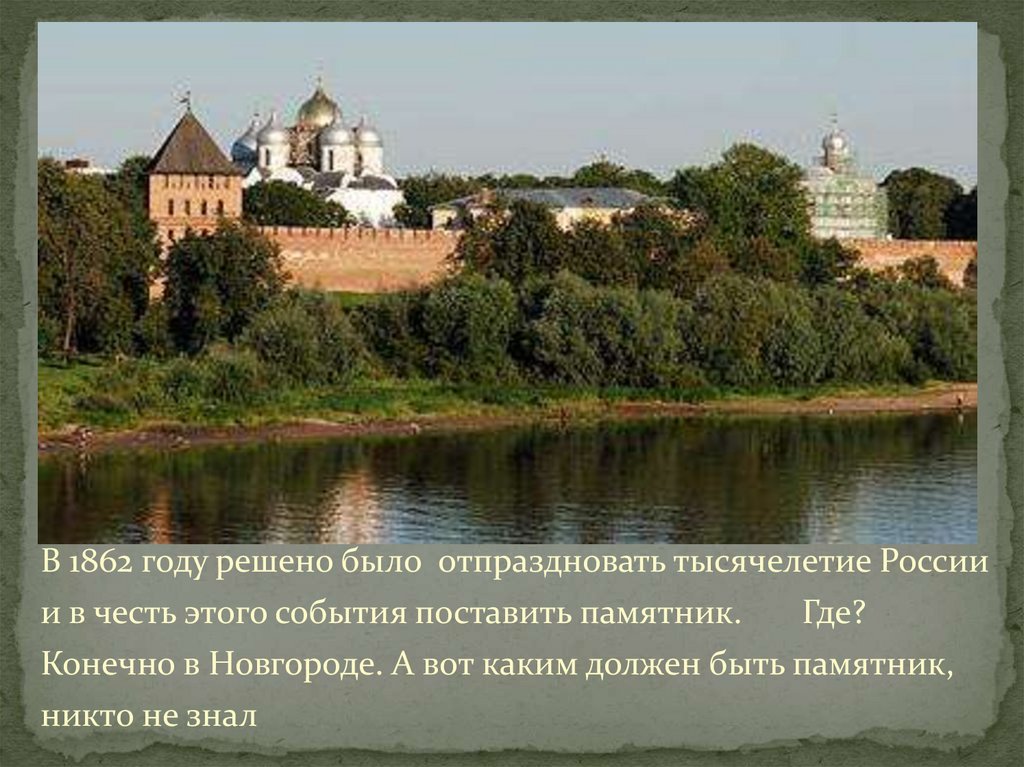 В 1862 году решено было отпраздновать тысячелетие Россиии в честь этого события поставить памятник.
