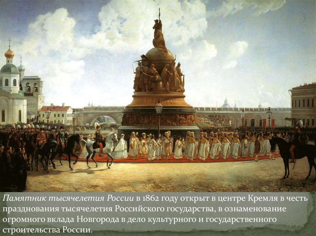 Памятник тысячелетия России в 1862 году открыт в центре Кремля в честьпразднования тысячелетия Российского государства, в ознаменование