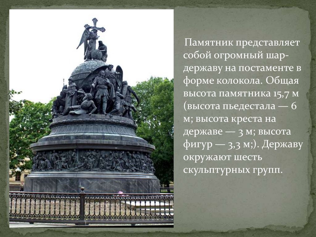 9. Другого такого монумента в мире нет. Он повествует не об одном событии, а о целом тысячелетии. Посвящен не одному человеку,