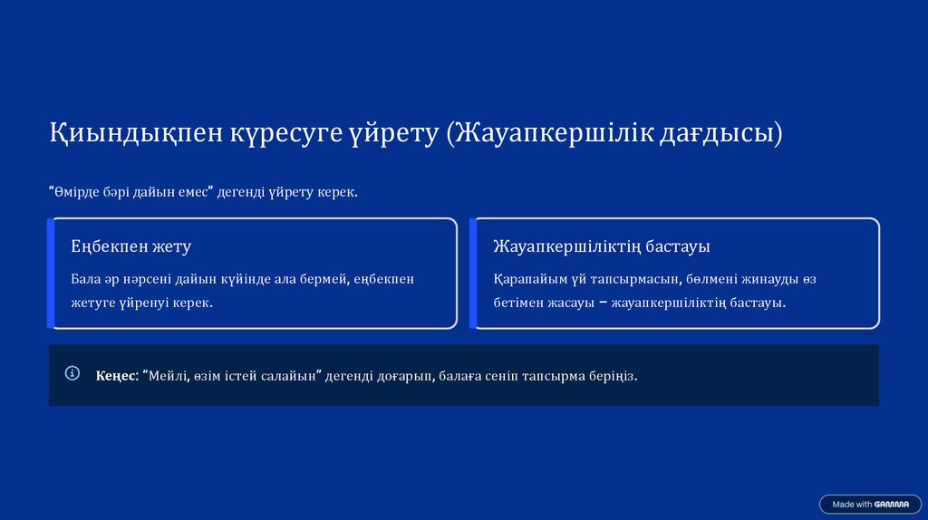 Қиындықпен күресуге үйрету (Жауапкершілік дағдысы)“Өмірде бәрі дайын емес” дегенді үйрету керек.