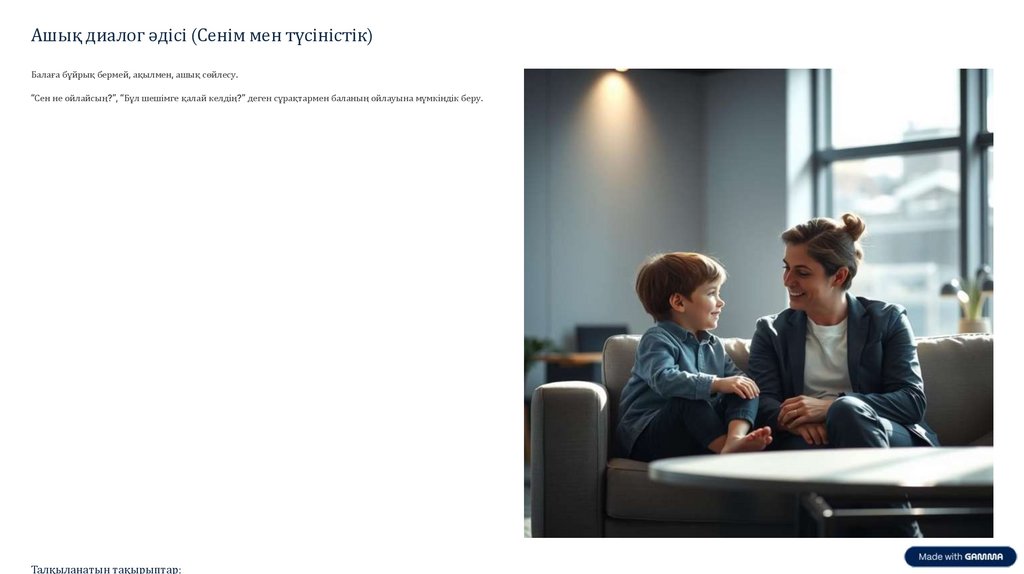 Ашық диалог әдісі (Сенім мен түсіністік)Балаға бұйрық бермей, ақылмен, ашық сөйлесу.