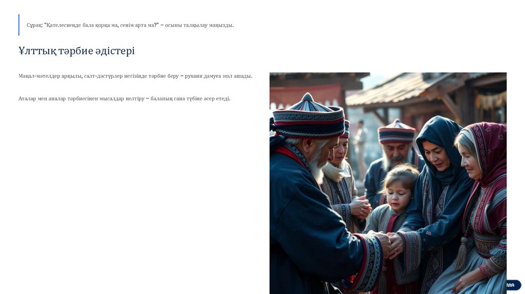 Сұрақ: “Қателескенде бала қорқа ма, сенім арта ма?” – осыны талқылау маңызды.Ұлттық тәрбие әдістері
