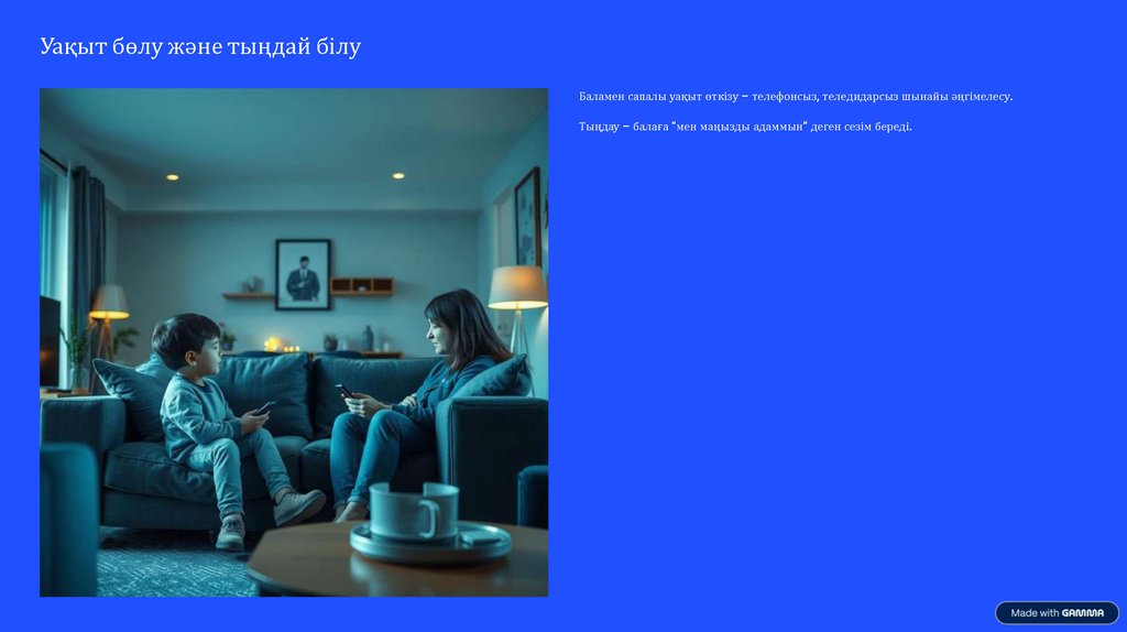 Уақыт бөлу және тыңдай білуБаламен сапалы уақыт өткізу – телефонсыз, теледидарсыз шынайы әңгімелесу.