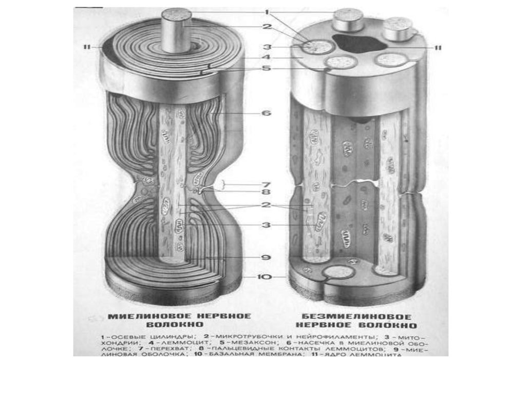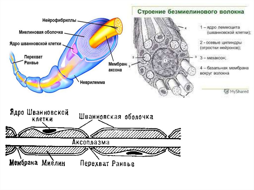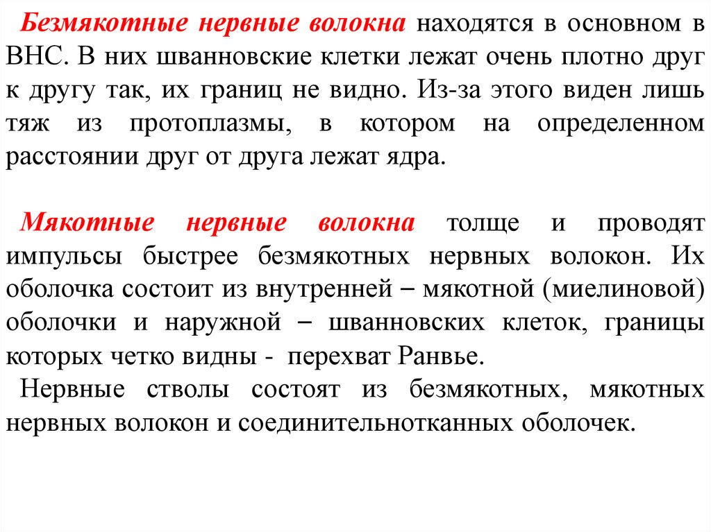 Безмякотные нервные волокна находятся в основном вВНС. В них шванновские клетки лежат очень плотно друг