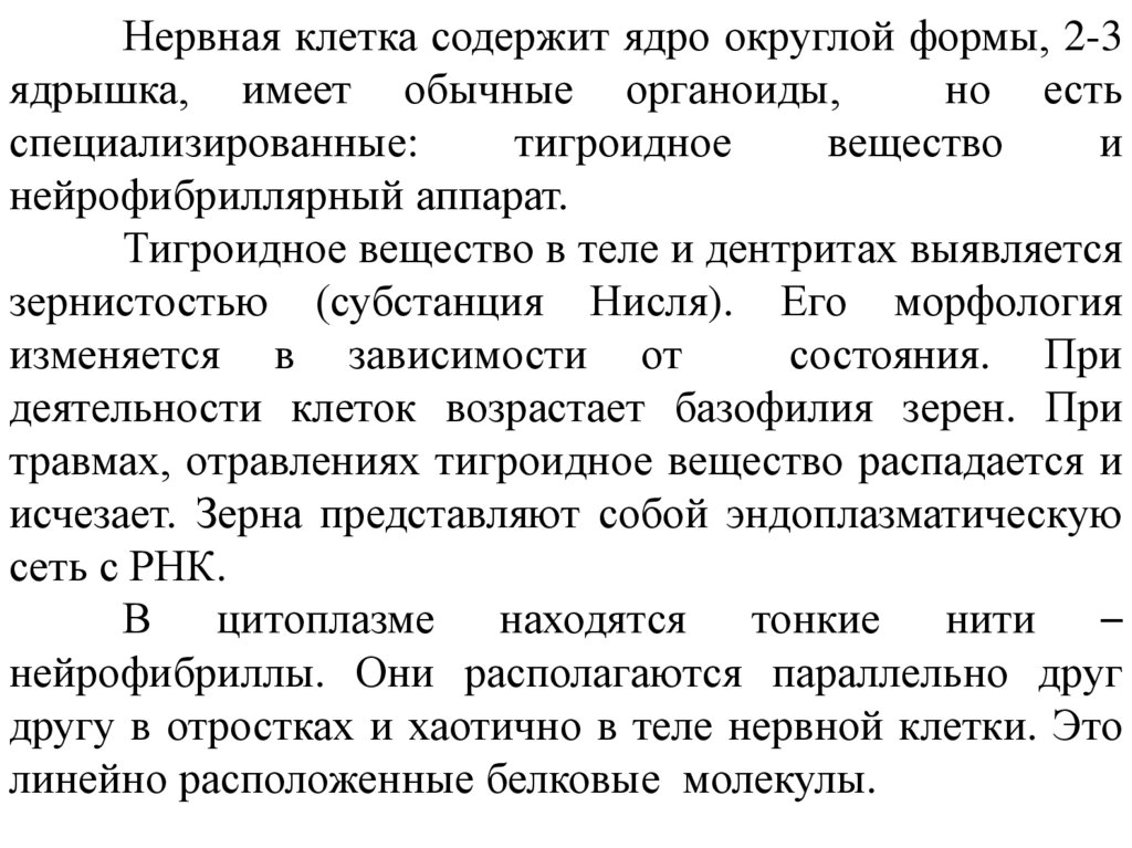 Нервная клетка содержит ядро округлой формы, 2-3ядрышка, имеет обычные органоиды,
